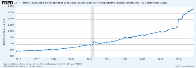 O setor NDFI é composto por uma grande variedade de credores não bancários, como credores automotivos subprime, originadores de hipotecas, credores consignados, empresas de financiamento de equipamentos (payday), credores ponte para imóveis comerciais, plataformas de empréstimos fintech e empresas de crédito privado. Em essência, as NDFIs podem conceder empréstimos arriscados com juros altos que os próprios bancos não podem conceder, mas as NDFIs são consideradas suficientemente creditáveis segundo as regulamentações atuais para que os bancos possam emprestar. Assim, o empréstimo bancário para NDFIs serve como a mais recente forma de arbitragem regulatória, contornando tentativas burocráticas de evitar exposições bancárias à qualidade de crédito em constante deterioração que sempre afeta expansões bancárias sem restrições. Os reguladores nunca parecem aprender que nenhum buffer de capital obrigatório é suficiente para evitar a necessidade de resgates massivos ou crises de crédito criadas pelo banco central em tempo hábil.