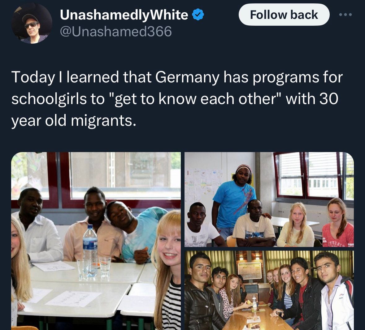 - O processo é frequentemente celebrado pelos próprios europeus, especialmente as jovens que foram assim condicionadas. Frases como “a diversidade é a nossa força” são onipresentes hoje, assim como a crença de que as crianças mestiças são “melhores“. Isso contrasta fortemente com a imagem mental de genocídio das pessoas como algo que nenhum do grupo-alvo poderia desfrutar, celebrar ou desejar.