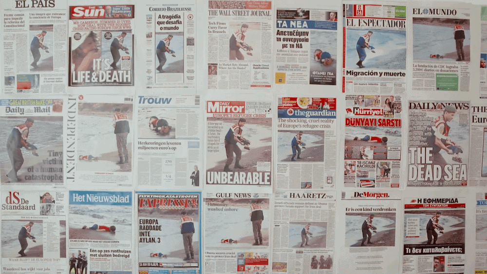 Uma série de manchetes de jornais sincronizadas, “defendendo” a permissão da entrada de um grande número de bomalianos em Nórdia com base na morte de um menino. (Os inúmeros nordienses mortos por bomalianos não têm importância.)