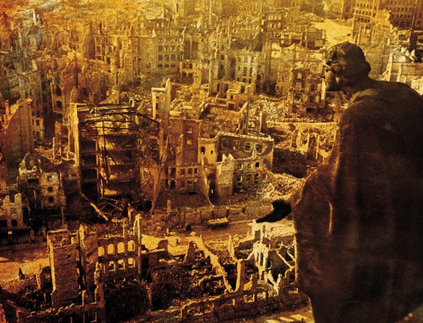 Mas a verdade é mais simples e muito mais trágica. A guerra não foi um despertar moral global, mas um choque de impérios, uma continuação de lutas não resolvidas do século anterior e o culminar de uma Guerra Civil Europeia, uma fratricida guerra entre irmãos travada com crueldade sem precedentes por todos os lados envolvidos. Suas causas estavam na traição diplomática, no extremismo ideológico e na ambição territorial. Suas consequências não foram paz e liberdade, mas divisão, fome, ocupação e subjugação de metade da Europa, a sementeira do homem ocidental, atrás do arame farpado de uma nova tirania. A guerra não inaugurou uma nova era de liberdade. Marcou o colapso da autoconfiança ocidental, o crepúsculo de sua vitalidade espiritual e o início de sua longa desintegração moral.