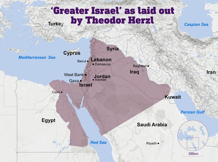O conceito de “Grande Israel” foi explorado por Theodor Herzl, pai do sionismo político, que escreveu em seus diários que o Estado judeu deveria se estender “do riacho do Egito ao Eufrates”.