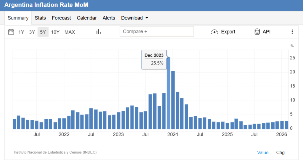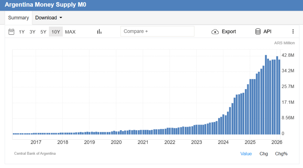 Por outro lado, Gut exagera a importância do superávit orçamentário para a economia argentina. Se é que possui alguma importância, o superávit foi alcançado não apenas com cortes orçamentários, mas também com aumentos de impostos, que são inerentemente prejudiciais para a economia. Além disso, o superávit não impediu Milei de se envolver em níveis históricos de impressão de dinheiro, ou seja, de inflação coercitiva (quadruplicando a base monetária em menos de dois anos). Isso também refuta completamente a narrativa heroica da luta de Milei contra a inflação dos preços. E embora os números oficiais da inflação dos preços tenham mostrado uma queda geral significativa durante seu primeiro ano e meio no cargo (embora tenham mostrado uma leve tendência de alta novamente no último ano), isso não pode ser considerado uma grande conquista — especialmente considerando toda a política monetária de Milei.