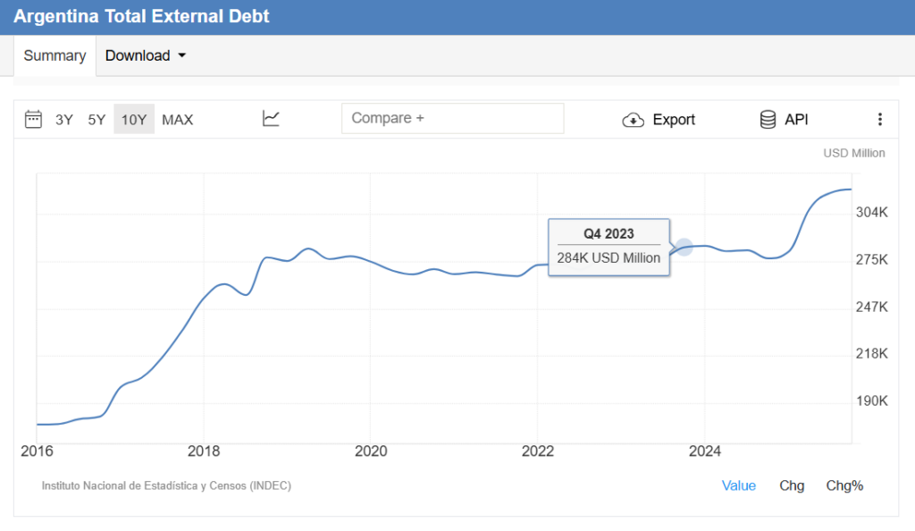 Como vimos, embora tenha havido vários cortes de impostos aqui e ali de tempos em tempos durante o mandato de Milei, os impostos mais relevantes permaneceram praticamente inalterados. Além disso, Milei conseguiu até fazer o Congresso aprovar, em meados de 2024, a reinstauração de uma faixa de imposto de renda para quase um milhão de assalariados em um país de 44 milhões de habitantes. Ainda pior é o caso da dívida, já que tanto a dívida pública bruta quanto a externa aumentaram significativamente sob o governo Milei.