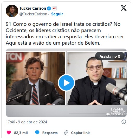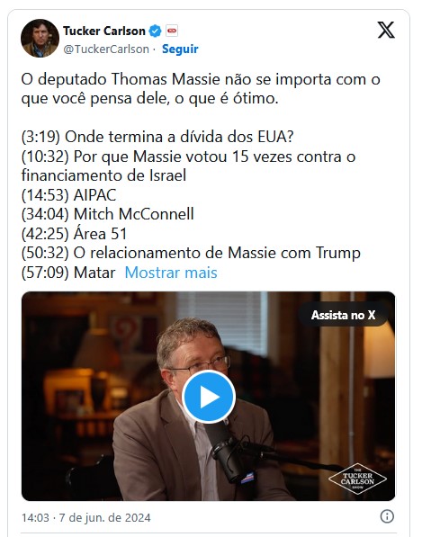 Mais recentemente, a longa entrevista de Carlson com o deputado Thomas Massie revelou a importante informação de que cada membro do Congresso americano recebe um conselheiro pessoal do AIPAC, que monitora e dirige o representante eleito em todas as questões importantes para o extremamente poderoso Lobby de Israel.