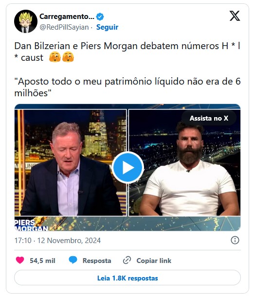 Tendo assistido cuidadosamente a entrevista inteira algumas vezes, achei que Bilzerian se comportou muito bem, não sendo nem defensivo nem excessivamente agressivo, mas apenas mencionando alguns dos problemas mais óbvios tanto com a propaganda de atrocidades anti-Hamas quanto com a narrativa do Holocausto, elementos bem conhecidos por todos que investigaram esses assuntos, mas totalmente desconhecidos para Morgan e provavelmente quase todo o seu público mainstream.