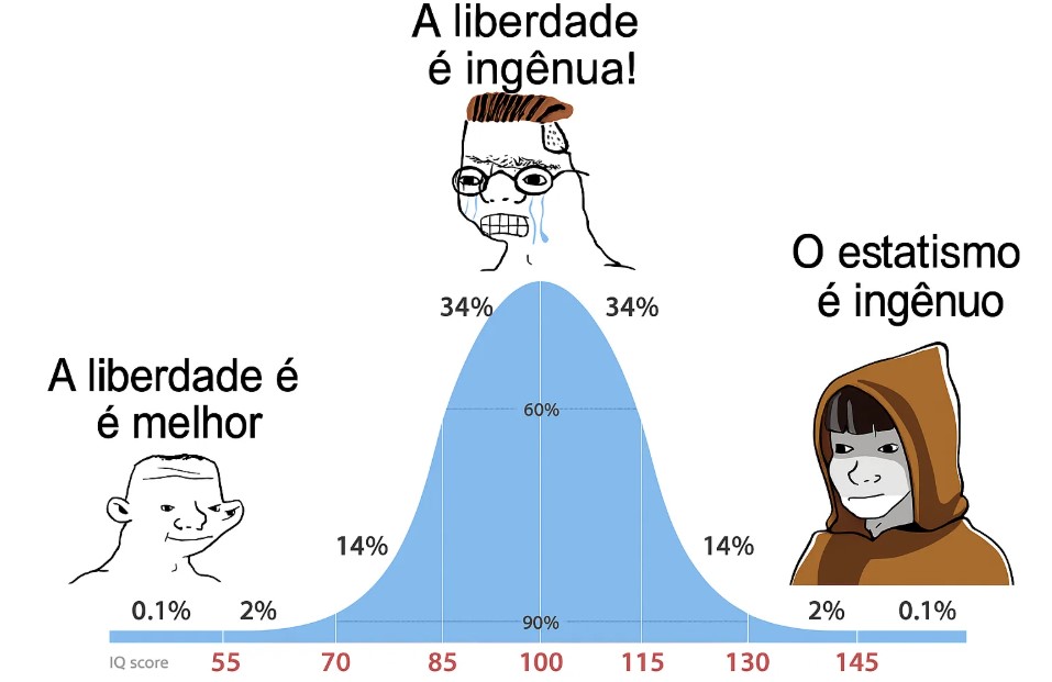 Un razonamiento similar se aplica a muchos otros temas. La postura libertaria parece ingenua porque su argumento más conocido lo es, pero en realidad está más informada que la postura estatista –el estatista, ajeno a lo que sabe el libertario, simplemente no lo ve, e irónicamente procede a hablarle como si éste fuera el ingenuo y miope. En esencia, ésta es la la curva de la campana del CI.